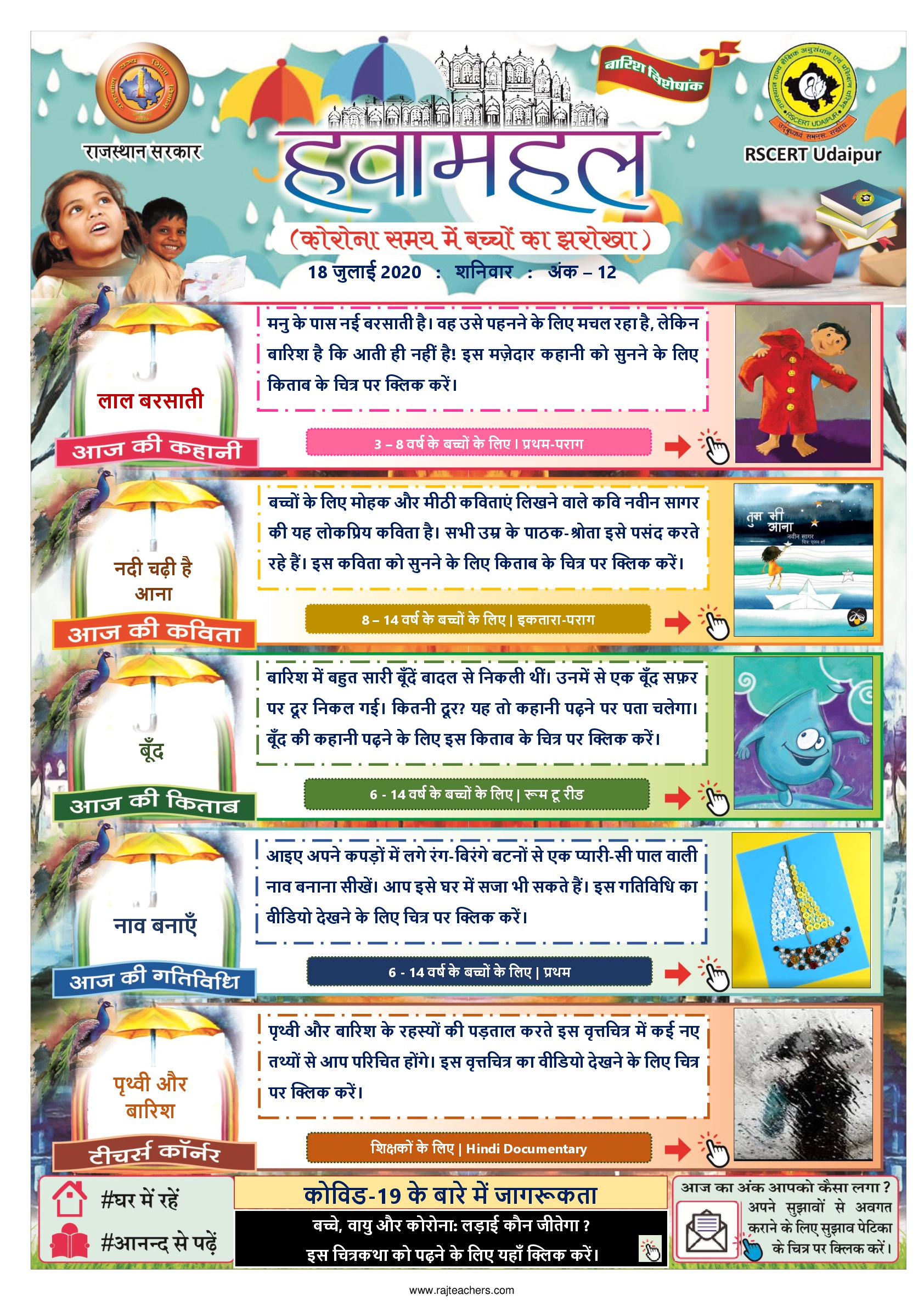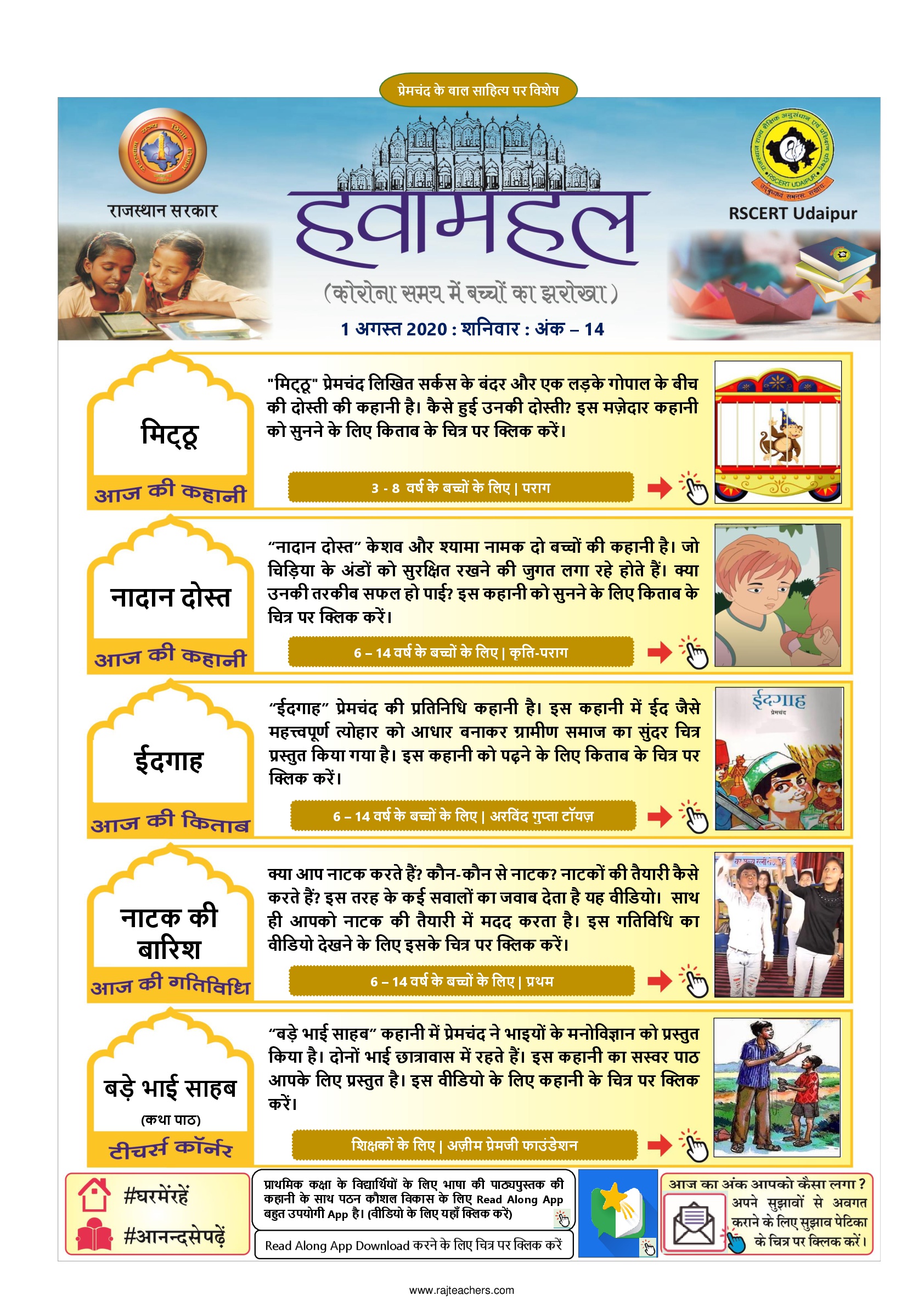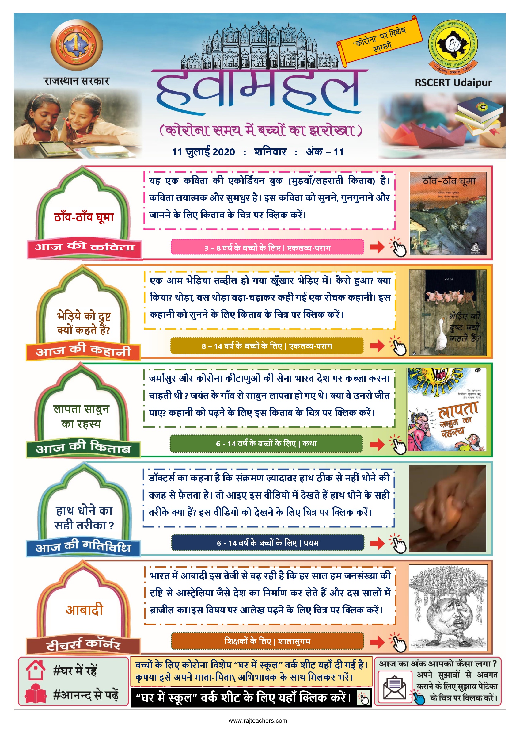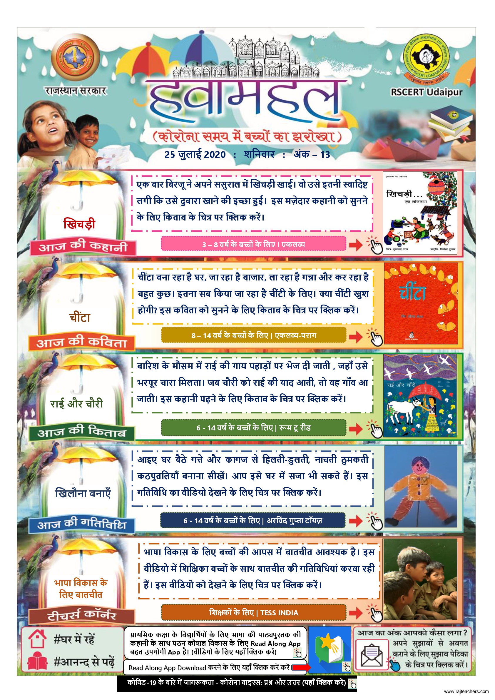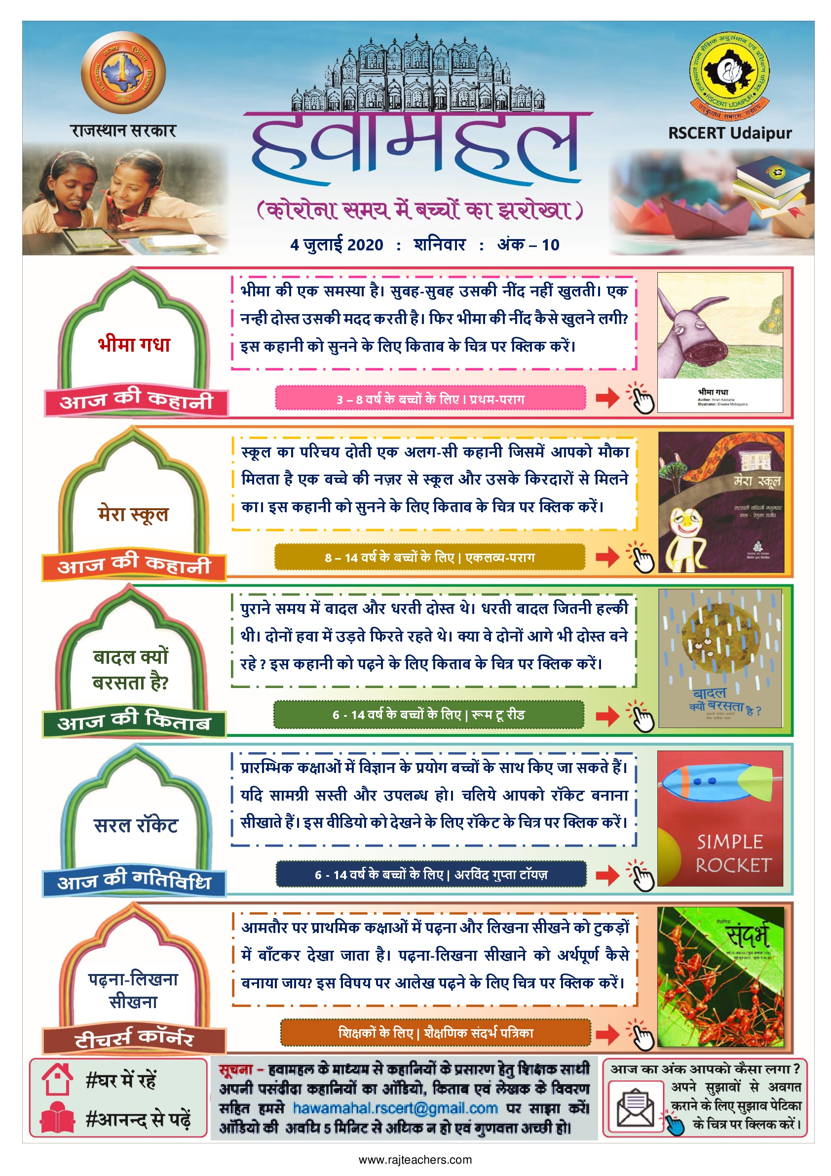 विद्यार्थियों के चिंतन कौशल को विकसित करने और पठन-पाठन में रुचि जागृत करने के उद्देश्य से RSCERT उदयपुर द्वारा एक विशेष कार्यक्रम "हवामहल" में मज़ेदार कहानियाँ, गतिविधियों पर आधारित सामग्री मोबाइल फोन पर उपलब्ध करवाई जा रही है।