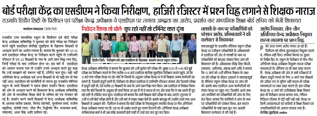 14 March, 2018 : राजकीय माध्यमिक विद्यालय के प्रिंसिपल एवं बोर्ड परीक्षा केंद्र अधीक्षक शक्ति सिंह ने बुधवार को बोर्ड परीक्षा का निरीक्षण करने पहुंचे SDM शेर सिंह लुहाडिया के खिलाफ शिक्षकों से अभद्रता करने का आरोप लगाया है I बताया की बुधवार को 10:15 बजे SDM परीक्षा केंद्र पर निरीक्षण करने पहुंचे तो उपस्थिति रजिस्टर में उन 25 शिक्षकों के नाम के आगे प्रश्न चिन्ह लगा दिए, जिन्हें परीक्षा के बाद उपस्थित होना था I इस बारे में SDM को अवगत कराया गया तो उन्होंने अभद्रता करते हुए कहा की उन्हें समझाने की जरूरत नही है, टर्मिनेट करा दूंगा I यही नही अतिरिक्त केंद्र अधीक्षक एवं अन्य शिक्षकों से भी सही ढंग से पेश नही आये I SDM की कार्यशैली से नाराज हुए राजकीय सीनियर स्कूल के सभी शिक्षकों ने एकत्र होकर प्रदर्शन किया I SDM की ओर से अभद्रता करने की शिकायत केंद्र अधीक्षक शक्ति सिंह की ओर से माध्यमिक शिक्षा बोर्ड के सचिव को पत्र भेजकर की गयी है I प्रदर्शन करने वाले शिक्षकों में केंद्र अधीक्षक शक्ति सिंह के आलावा सतीश प्रकाश, विनोद सोलंकी, पुरुषोतम शर्मा, राजिव सहारिया, संतोष लाल, नरेश जैन, रिद्धिचंद जैन, घनश्याम शर्मा, रमेश चंद, अमर सिंह आदि शामिल रहे I